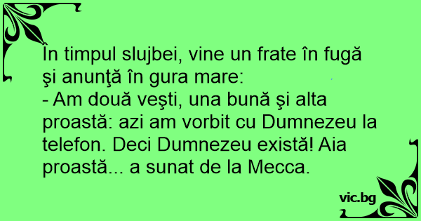 - Am două veşti, una bună şi alta proastă: azi am vorbit cu Dumnezeu la telefon. Deci Dumnezeu există! Aia proastă... a sunat de la Mecca.