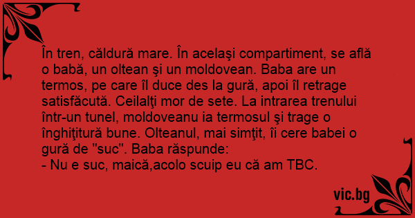 În tren, căldură mare. În acelaşi compartiment, se află o babă, un oltean şi un moldovean. Baba are un termos, pe care îl duce des la gură, apoi îl retrage satisfăcută. Ceilalţi mor de sete. La intrarea trenului într-un tunel, moldoveanu ia termosul şi trage o înghiţitură bune. Olteanul, mai simţit, îi cere babei o gură de "suc". Baba răspunde: