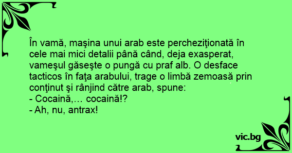 În vamă, maşina unui arab este percheziţionată în cele mai mici detalii până când, deja exasperat, vameşul găseşte o pungă cu praf alb. O desface tacticos în faţa arabului, trage o limbă zemoasă prin conţinut şi rânjind către arab, spune: