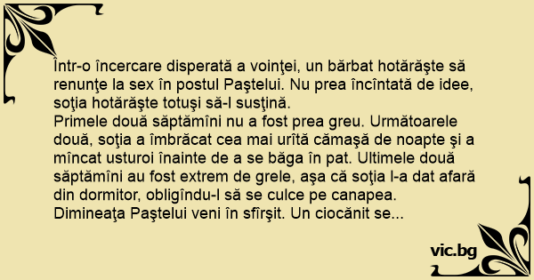 Într-o încercare disperată a voinţei, un bărbat hotărăşte să renunţe la sеx în postul Paştelui. Nu prea încîntată de idee, soţia hotărăşte totuşi să-l susţină.