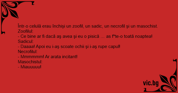 Говорили си садист, некрофил, зоофил, педофил и мазохист: Un sadique, un masochiste, un tueur en série, un nécrophile, un zoophile et un pyromane sont assis sur un banc dans un parc et s’ennuient à mourir. A sadist, a masochist, a murderer, a necrophile, a zoophile and a pyromaniac are all sitting on a bench in a mental institution. Un scatophile, un sadique, un psychopathe, un zoophile, nécrophile et un masochiste croisent un chat. Un zoophile, un pédophile, un nécrophile et un sadomaso s'ennuient. Le zoophile : - je baiserai bien un chat. Le pédophile : - Un chaton alors ! Le nécrophile : - Un chaton mort.. Le SM : - Miaou ? W celi siedzą razem: gwałciciel, zoofil, pedofil, gerontofil, sadysta, nekrofil i masochista. Gwałciciel: - Eh, jak bym kogoś zgwałcił. Zoofil: - Kotka na przykład. Pedofil: - Tak, tylko młodego,... Ein Zoologe, ein Sadist, ein Killer, ein Nekrophiler, ein Pyromane und ein Masochist langweilen sich. Mmmh was sollen wir mal machen? Sagt der Zoologe: "Holen wir uns einen Hund!". "Okay" sagt... Um sádico, um masoquista, um assassino, um necrófilo, um zoófilo e um pirômano estão sentados num banco de jardim dentro de um sanatório, sem saber como ocupar o tempo. De repente eles veem um gato... C'est un sadique, un tueur en série, un masochiste, un pyromane et un nécrophile qui sont dans un parc. (Déjà l'histoire commence bien) Le sadique, qui s'ennuie, dit : "Venez on torture un chat !"... In de psychiatrische afdeling van het gevang zitten een dief, een pedofiel, een sadist, een moordenaar, een necrfiel, een pyromaan en een sado-masochist zich steendood te vervelen. De dief zegt: en... Een sadist, een masochist, een seriemoordenaar, een necrofiel, een zofiel en een pyromaan, zitten op een bankje in het park en vervelen zich te pletter Zegt de zoofiel : - Kom, we pakken een kat.... Estan un sádico, un masoquista, un asesino, un necrófilo, un zoófilo y un pirómano sentados en un banco de un parque sin saber que hacer para matar el aburrimiento cuando... Dice el zoófilo: "Vamos... Zoophile : Personne pratiquant la zoophilie, déviation sexuelle poussant à avoir des rapports sexuels avec des animaux.   Pyromane : Admiration du feu, il le met d'ailleurs souvent. Necrophile :... Intr-o celula de inchisoare erau un zoofil, un necrofil, un sadic si un masochist. Plictisindu-se ei la un moment dat incepe zoofilu': - Mama, de-as avea acuma o pisica! mama ce i-as face, pe toate... Dans un asile psychiatrique, un masochiste, un zoophile, un sadique, un assassin, un nécrophile et un pyromane s'ennuient. Le zoophile dit : - Et si on enculait le chat? Alors le sadique répond : -... Un giorno si trovano su una panchina: un piromane, uno zoofilo, un necrofilo, un maniaco e un masochista. Non sapendo che fare, lo zoofilo propone: perchè non andiamo a prendere un gattino Il...