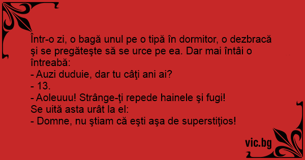 Într-o zi, o bagă unul pe o tipă în dormitor, o dezbracă şi se pregăteşte să se urce pe ea. Dar mai întâi o întreabă: