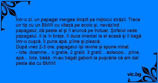 Într-o zi, un papagal mergea liniştit pe mijlocul străzii. Trece un tip cu un BMW cu viteză pe acolo şi, nevăzînd papagalul, dă peste el şi îl aruncă pe trotuar. Şoferul vede papagalul, îl ia în braţe, îl duce imediat la el acasă şi îl bagă într-o cuşcă. Îi pune apă, pîine şi pleacă.