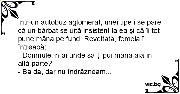 Într-un autobuz aglomerat, unei tipe i se pare că un bărbat se uită insistent la ea şi că îi tot pune mâna pe fund. Revoltată, femeia îl întreabă: