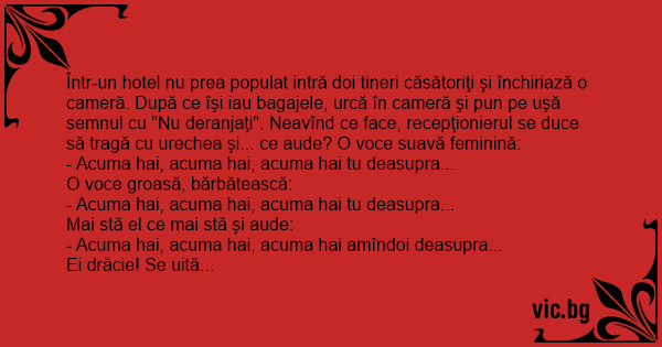 Într-un hotel nu prea populat intră doi tineri căsătoriţi şi închiriază o cameră. După ce îşi iau bagajele, urcă în cameră şi pun pe uşă semnul cu "Nu deranjaţi". Neavînd ce face, recepţionierul se duce să tragă cu urechea şi... ce aude? O voce suavă feminină: