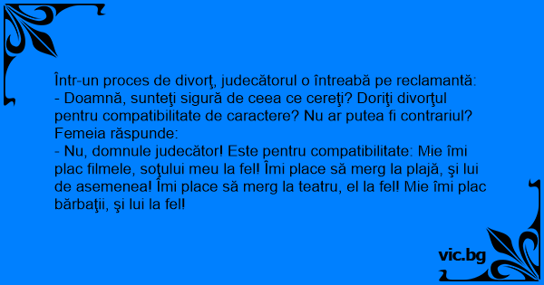 - Nu, domnule judecător! Este pentru compatibilitate: Mie îmi plac filmele, soţului meu la fel! Îmi place să merg la plajă, şi lui de asemenea! Îmi place să merg la teatru, el la fel! Mie îmi plac bărbaţii, şi lui la fel!