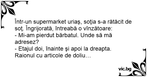 Într-un supermarket uriaş, soţia s-a rătăcit de soţ. Îngrijorată, întreabă o vînzătoare: