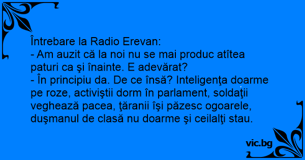 - În principiu da. De ce însă? Inteligenţa doarme pe roze, activiştii dorm în parlament, soldaţii veghează pacea, ţăranii îşi păzesc ogoarele, duşmanul de clasă nu doarme şi ceilalţi stau.