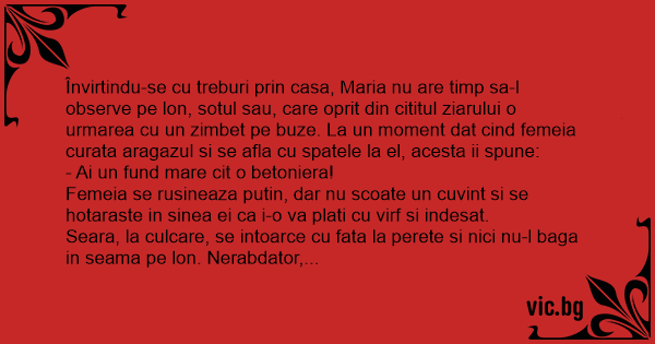 Învirtindu-se cu treburi prin casa, Maria nu are timp sa-l observe pe lon, sotul sau, care oprit din cititul ziarului o urmarea cu un zimbet pe buze. La un moment dat cind femeia curata aragazul si se afla cu spatele la el, acesta ii spune: