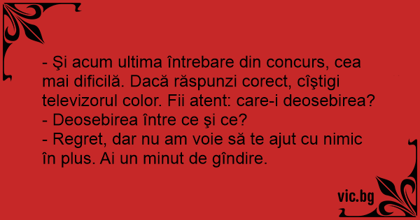 - Şi acum ultima întrebare din concurs, cea mai dificilă. Dacă răspunzi corect, cîştigi televizorul color. Fii atent: care-i deosebirea?