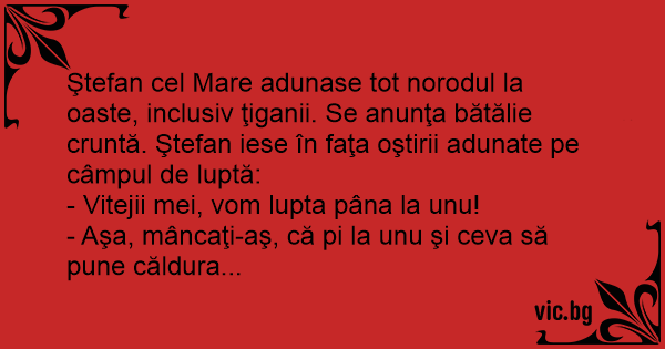 Ştefan cel Mare adunase tot norodul la oaste, inclusiv ţiganii. Se anunţa bătălie cruntă. Ştefan iese în faţa oştirii adunate pe câmpul de luptă: