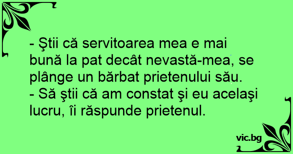 - Ştii că servitoarea mea e mai bună la pat decât nevastă-mea, se plânge un bărbat prietenului său.