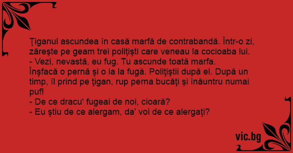 Ţiganul ascundea în casă marfă de contrabandă. Într-o zi, zăreşte pe geam trei poliţişti care veneau la cocioaba lui.