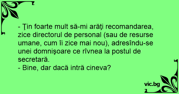 - Ţin foarte mult să-mi arăţi recomandarea, zice directorul de personal (sau de resurse umane, сuм îi zice mai nou), adresîndu-se unei domnişoare ce rîvnea la postul de secretară.