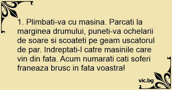 1. Plimbati-va cu masina. Parcati la marginea drumului, puneti-va ochelarii de soare si scoateti pe geam uscatorul de par. Indreptati-l catre masinile care vin din fata. Acum numarati cati soferi franeaza brusc in fata voastra!