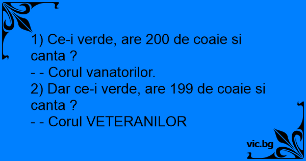 1) Ce-i verde, are 200 de coaie si canta ? - - Corul vanatorilor. 2) Dar ce-i verde, are 199 de coaie si canta ? - - Corul VETERANILOR