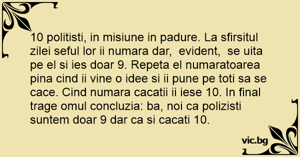 10 politisti, in misiune in padure. La sfirsitul zilei seful lor ii numara dar, evident, se uita pe el si ies doar 9. Repeta el numaratoarea pina cind ii vine o idee si ii pune pe toti sa se cace. Cind numara cacatii ii iese 10. In final trage omul concluzia: ba, noi ca polizisti suntem doar 9 dar ca si cacati 10.