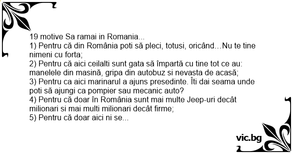 19) Pentru că atunci cind toate locurile din iad vor fi ocupate, România va deveni destinatia de rezervă. Cei care rămân aici vor fi scutiti de cheltuielile de transport