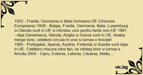 1952 - Franta, Germania si Italia formeaza UE (Uniunea Europeana) 1958 - Belgia, Franta, Germania, Italia, Luxemburg si Olanda sunt in UE si introduc vize pentru tarile non-UE 1981 - deja Danemarca, Irlanda, Anglia si Grecia sunt in UE, treaba merge bine, cetatenii circula in voie si lumea e fericita!