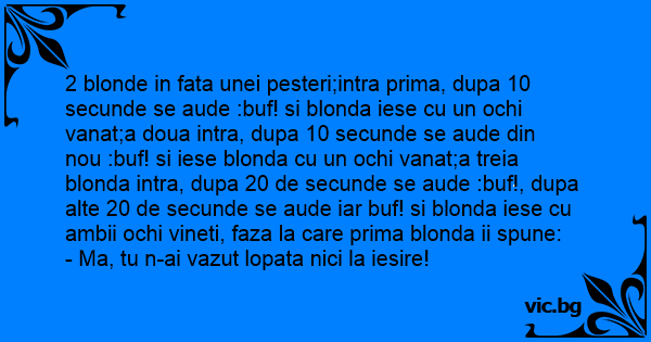 2 blonde in fata unei pesteri;intra prima, dupa 10 secunde se aude :buf! si blonda iese cu un ochi vanat;a doua intra, dupa 10 secunde se aude din nou :buf! si iese blonda cu un ochi vanat;a treia blonda intra, dupa 20 de secunde se aude :buf!, dupa alte 20 de secunde se aude iar buf! si blonda iese cu ambii ochi vineti, faza la care prima blonda ii spune: