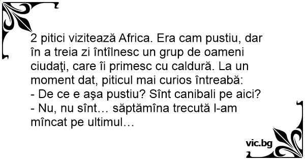 2 pitici vizitează Africa. Era cam pustiu, dar în a treia zi întîlnesc un grup de oameni ciudaţi, care îi primesc cu caldură. La un moment dat, piticul mai curios întreabă: