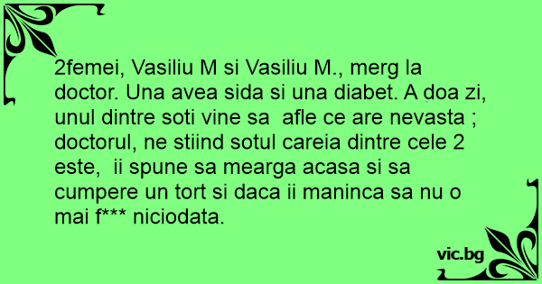 2femei, Vasiliu M si Vasiliu M., merg la doctor. Una avea sida si una diabet. A doa zi, unul dintre soti vine sa afle ce are nevasta ; doctorul, ne stiind sotul careia dintre cele 2 este, ii spune sa mearga acasa si sa cumpere un tort si daca ii maninca sa nu o mai f*** niciodata.