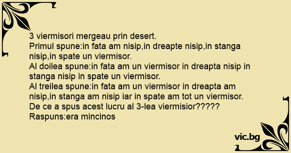 Primul spune:in fata am nisip,in dreapte nisip,in stanga nisip,in spate un viermisor.