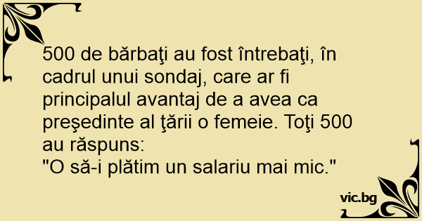 500 de bărbaţi au fost întrebaţi, în cadrul unui sondaj, care ar fi principalul avantaj de a avea ca preşedinte al ţării o femeie. Toţi 500 au răspuns: