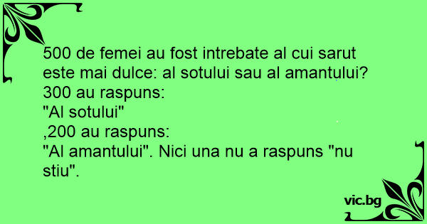 500 de femei au fost intrebate al cui sarut este mai dulce: al sotului sau al amantului? 300 au raspuns: