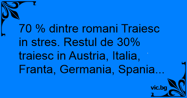 70 % dintre romani Traiesc in stres. Restul de 30% traiesc in Austria, Italia, Franta, Germania, Spania...