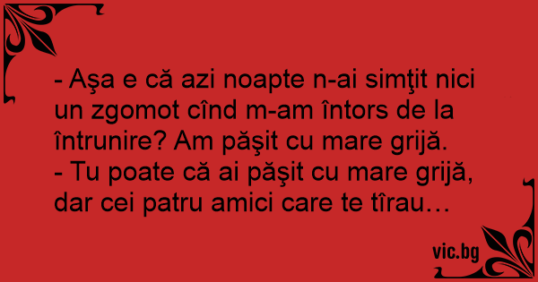 - Aşa e că azi noapte n-ai simţit nici un zgomot cînd m-am întors de la întrunire? Am păşit cu mare grijă.