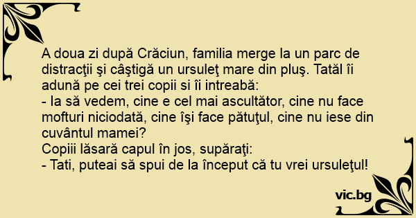 A doua zi după Crăciun, familia merge la un parc de distracţii şi câştigă un ursuleţ mare din pluş. Tatăl îi adună pe cei trei copii si îi intreabă: