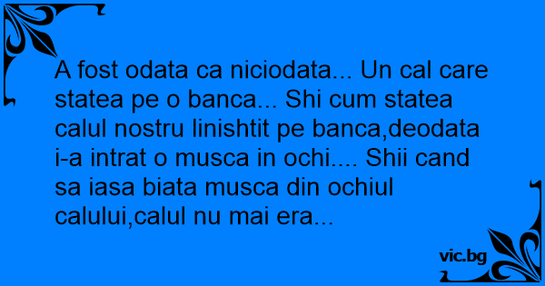 A fost odata ca niciodata... Un cal care statea pe o banca... Shi сuм statea calul nostru linishtit pe banca,deodata i-a intrat o musca in ochi.... Shii cand sa iasa biata musca din ochiul calului,calul nu mai era...