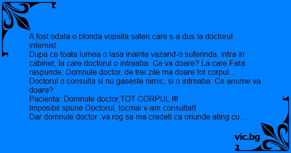 Dupa ce toata lumea o lasa inainte vazand-o suferinda, intra in cabinet, la care doctorul o intreaba: Ce va doare? La care Fata raspunde: Domnule doctor, de trei zile ma doare tot corpul... Doctorul o consulta si nu gaseste nimic, si o intreaba: Ce anume va doare?