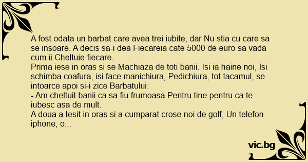 A fost odata un barbat care avea trei iubite, dar Nu stia cu care sa se insoare. A decis sa-i dea Fiecareia cate 5000 de euro sa vada сuм ii Cheltuie fiecare.