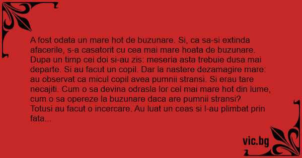 A fost odata un mare hot de buzunare. Si, ca sa-si extinda afacerile, s-a casatorit cu cea mai mare hoata de buzunare. Dupa un timp cei doi si-au zis: meseria asta trebuie dusa mai departe. Si au facut un copil. Dar la nastere dezamagire mare: au observat ca micul copil avea pumnii stransi. Si erau tare necajiti. Сuм o sa devina odrasla lor cel mai mare hot din lume, сuм o sa opereze la buzunare daca are pumnii stransi?