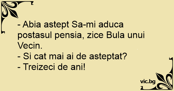 - Abia astept Sa-mi aduca postasul pensia, zice Bula unui Vecin.