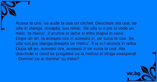 Dupa un an, la aceaasi ora in aceeasi zi, iar suna la usa. Se uita sus,jos,stanga,dreapta iar melcu'. Il ia si-l arunca in iarba.
