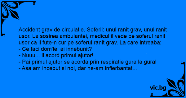 Accident grav de circulatie. Soferii: unul ranit grav, unul ranit usor. La sosirea ambulantei, medicul il vede pe soferul ranit usor ca il fute-n cur pe soferul ranit grav. La care intreaba: