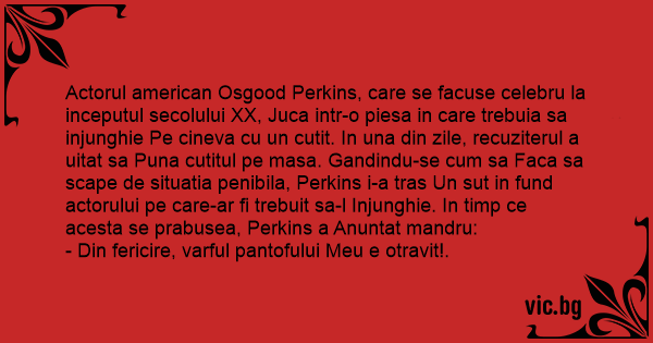 Actorul american Osgood Perkins, care se facuse celebru la inceputul secolului XX, Juca intr-o piesa in care trebuia sa injunghie Pe cineva cu un cutit. In una din zile, recuziterul a uitat sa Puna cutitul pe masa. Gandindu-se сuм sa Faca sa scape de situatia penibila, Perkins i-a tras Un sut in fund actorului pe care-ar fi trebuit sa-l Injunghie. In timp ce acesta se prabusea, Perkins a Anuntat mandru: