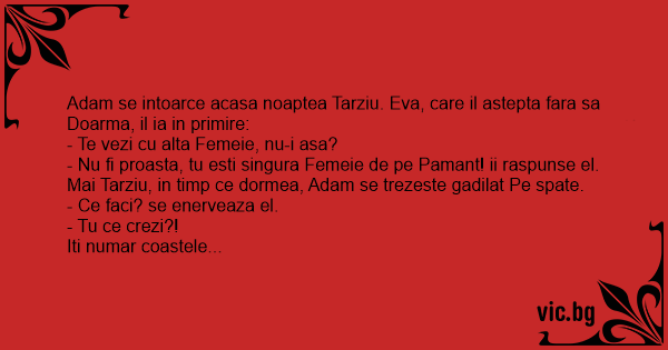 Adam se intoarce acasa noaptea Tarziu. Eva, care il astepta fara sa Doarma, il ia in primire: - Te vezi cu alta Femeie, nu-i asa? - Nu fi proasta, tu еsтi singura Femeie de pe Pamant! ii raspunse el. Mai Tarziu, in timp ce dormea, Adam se trezeste gadilat Pe spate. - Ce faci? se enerveaza el. - Tu ce crezi?! Iti numar coastele...