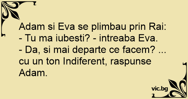 Adam en Eva lopen door hun paradijs wanneer Eva ineens vraagt “Adam, hou jij nog steeds van mij?” waarop Adam antwoordt “Ja natuurlijk, van wie anders?”