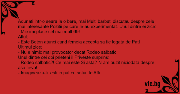Adunati intr-o seara la o bere, mai Multi barbati discutau despre cele mai interesante Pozitii pe care le-au experimentat. Unul dintre ei zice: