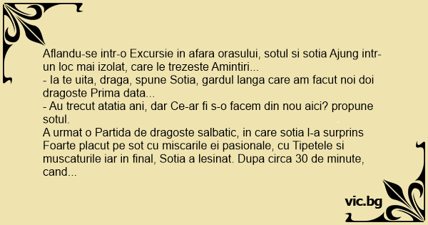 A urmat o Partida de dragoste salbatic, in care sotia l-a surprins Foarte placut pe sot cu miscarile ei pasionale, cu Tipetele si muscaturile iar in final, Sotia a lesinat. Dupa circa 30 de minute, cand Si-a revenit, sotul i-a spus: