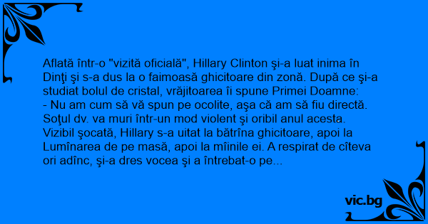 Aflată într-o "vizită oficială", Hillary Clinton şi-a luat inima în Dinţi şi s-a dus la o faimoasă ghicitoare din zonă. După ce şi-a studiat bolul de cristal, vrăjitoarea îi spune Primei Doamne: