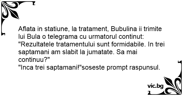 Aflata in statiune, la tratament, Bubulina ii trimite lui Bula o telegrama cu urmatorul continut: