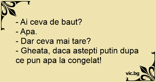 - Ai ceva de baut?<br />- Apa.<br />- Dar ceva mai tare?<br />- Gheata, daca astepti putin dupa ce pun apa la congelat!
