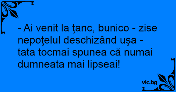- Ai venit la ţanc, bunico - zise nepoţelul deschizând uşa - tata tocmai spunea că numai dumneata mai lipseai!
