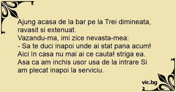 Ajung acasa de la bar pe la Trei dimineata, ravasit si extenuat.