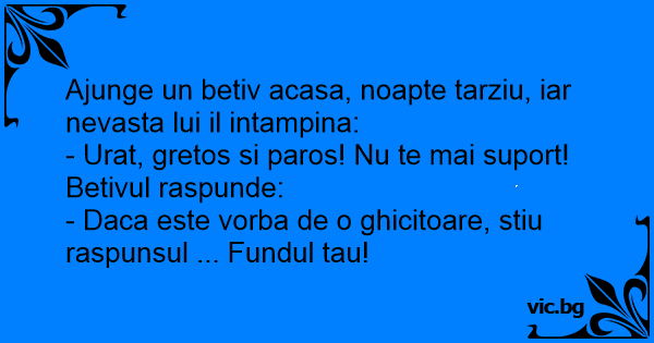 Ajunge un betiv acasa, noapte tarziu, iar nevasta lui il intampina: